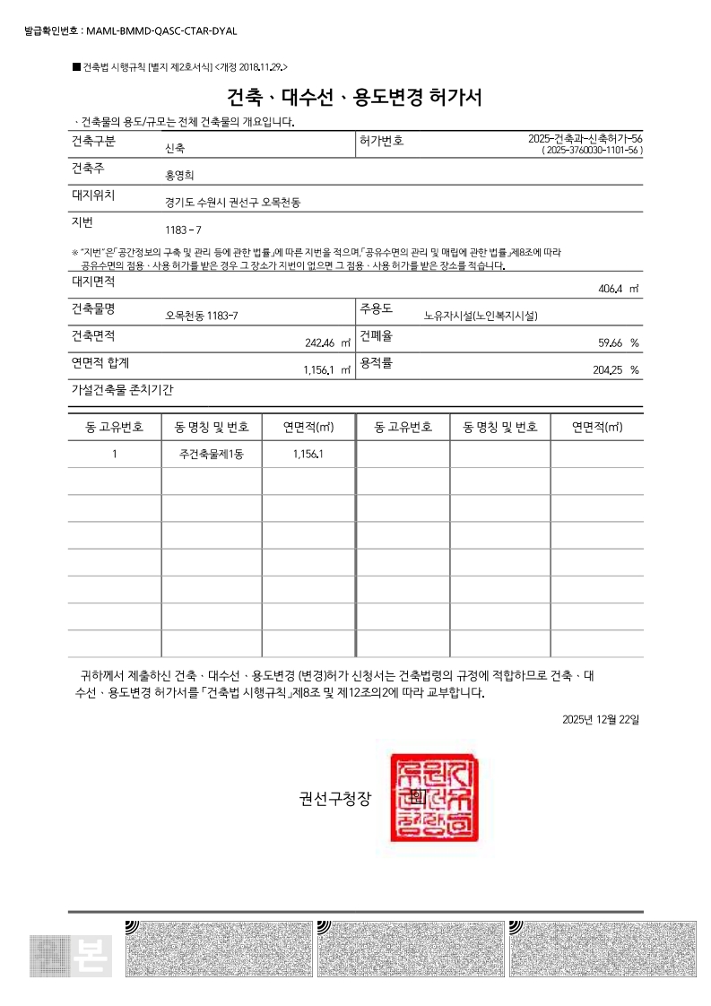 ±Ç¼±±¸ ¿À¸ñõµ¿ 1183¹øÁö ÀÏ´ë´Â ´ç»ç°¡ °³¹ßÇÑ ´ÜÁöÇü ¿ä¾ç¿øÀÎ( ¼¼³ª¿ø)À¸·Î Àüü 6°³µ¿À¸·Î µÇ¾î ÀÖÀ¸¸ç, ÇöÀç 4°³µ¿À¸·Î °³¹ßµÇ°í °¢°¢ÀÇ ÇÊÁö·Î ºÐ¾çµÇ¾î ¿ä¾ç¿øÀ¸·Î ¿î¿µÇϰí ÀÖ½À´Ï´Ù. ±×¸®°í ¸¶Áö¸·À¸·Î ´ç»ç°¡ º¸À¯ÇÑ 2°³ ÇÊÁöÀÇ °ÇÃàÇã°¡¸¦ ¿Ï·áÇÏ¿´½À´Ï´Ù. 1°³µ¿¿¡ 49¹èµå·Î 2°³µ¿ÀÌ¸ç °¢°¢ÀÇ µ¿À¸·Î ½ÅÃàÀ» ÇÒ ¿¹Á¤À̸ç ÇÕÇÏ¿© 100¹èµå°¡ °¡´ÉÇÕ´Ï´Ù ´ç»ç´Â ³²¾çÁÖÈ¿¿Í¼ö¿ä¾ç¿ø ºÎÆòÀÇ ¸Þµð¿ø¿ä¾ç¿øÀ» ¿î¿µÇϰí ÀÖÀ¸¸ç º»ÅäÁö¿¡ ÁذøÀ» ÇÒ°æ¿ì Á÷¿µÀ¸·Î ¿î¿µÇÒ¿¹Á¤ÀÔ´Ï´Ù *°ÇÃà°³¿ä- ´ëÁöÀ§Ä¡ : ¼ö¿ø½Ã ±Ç¼±±¸ ¿À¸ñõµ¿ 1183-6¹øÁö(1183-7¹øÁö µ¿ÀÏÇÔ) - ¿ëµµ : ³ëÀ¯Àڽü³(³ëÀοä¾ç½Ã¼³)- ´ëÁö¸éÀû : 406.20§³- °ÇÃà¸éÀû : 242.46§³ (°ÇÆóÀ² : 59.69%)- ¿¬ ¸é Àû : 1,156.10§³ (¿ëÀû·ü : 204.35%)- ±Ô¸ð : ÁöÇÏ1Ãþ / Áö»ó5Ãþ ¿ä¾ç½Ã¼³ °ÇÃ༳°è:: 02-557-9055 ÃÖÀÌ»ç ¿ä¾ç¿ø°³¿øÄÁ¼³ÆÃ: 010-7256-3345 È«ÀÌ»ç ¿ä¾ç¿ø ¸Å¸ÅÀÓ´ë 010-5850-9098 ¼³ÆÀÀå